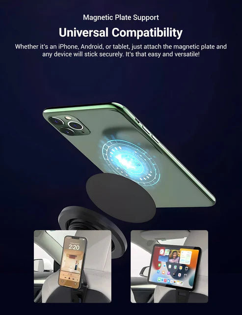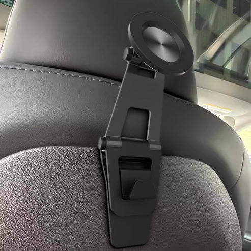 A sleek rear-seat magnetic phone holder designed for Tesla Model 3 and Model Y, offering secure mounting, 360° rotation, and effortless one-hand operation for rear passengers.